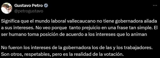 Tras la respuesta de la gobernadora Toro, Petro respondió con otro trino en el que reiteró su argumento de que los intereses que representa la gobernadora no son los del mundo laboral vallecaucano y aunque dijo que eran respetables, insistió en que esa fue la realidad que mostró la votación en el Congreso.