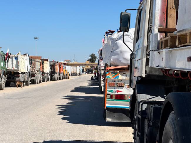 Camiones cargados de ayuda humanitaria en la frontera de la Franja de Gaza. FOTO: EFE (EFE)
