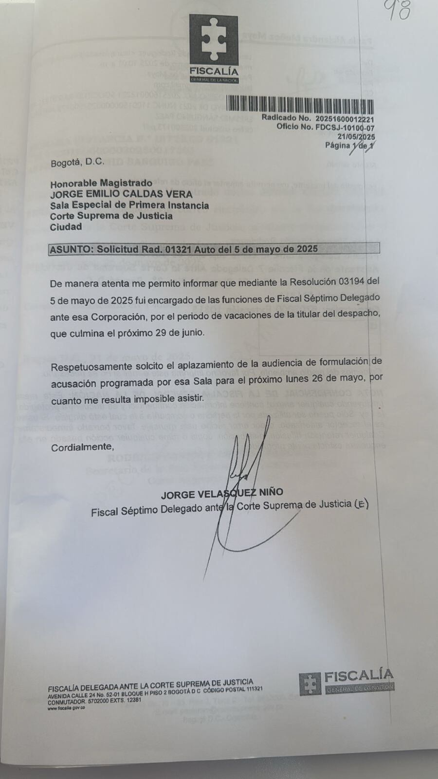 Pero el despacho del magistrado Jorge Emilio Caldas rechazó la petición y solicitó que precisamente dicha diligencia sea asumida por el fiscal encargado Velásquez o por quien el ente acusador disponga.