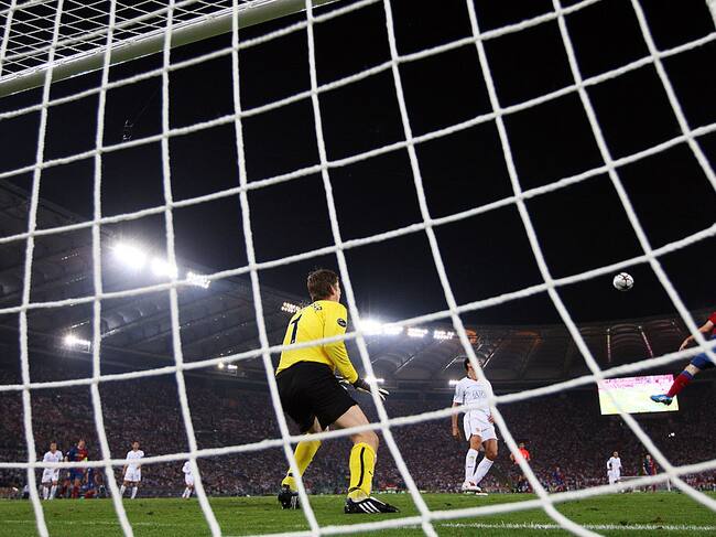 Messi, uno de los jugadores de menor estatura, anotó de cabeza colgando a Edwin van der Sar (que mide 1.97) tras un centro de larga distancia de Xavi Hernández. El gol, entre otras cosas, también fue relevante por la mítica celebración del argentino besando su guayo luego de anotar.
