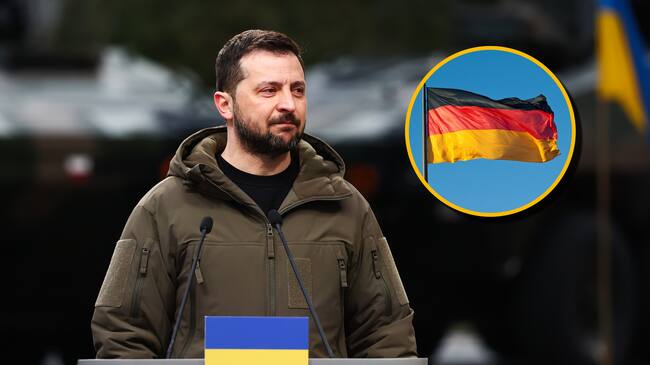 Zelenski y bandera de Alemania. Foto: Jakub Porzycki/NurPhoto y Caspar Benson vía Getty Images.