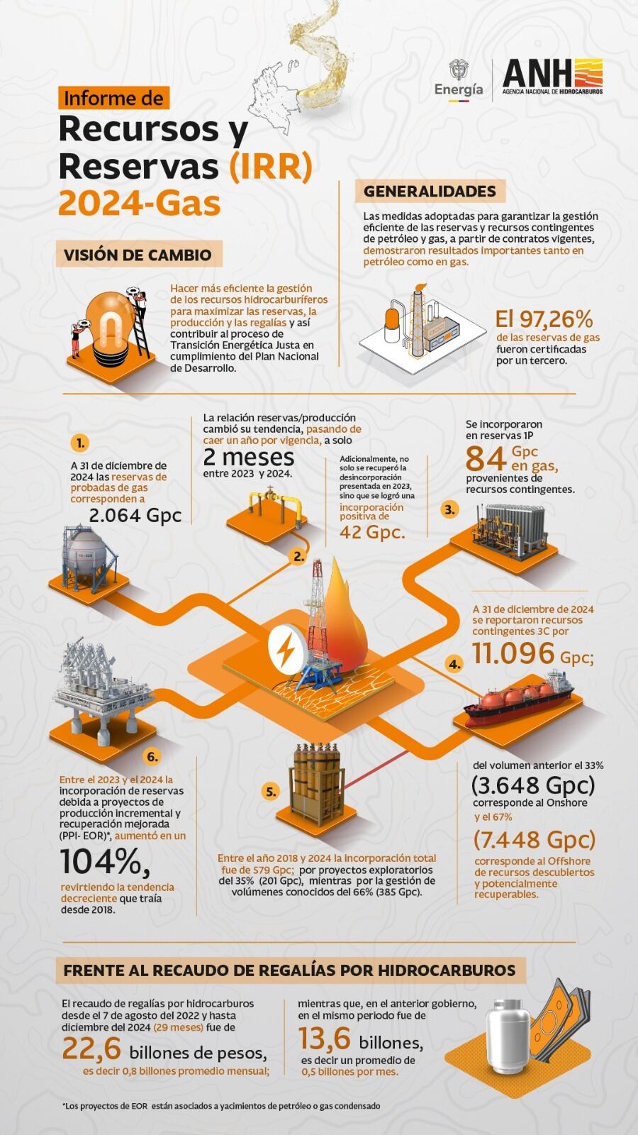 Por el lado de las reservas de gas, la ANH expuso que para 2024 se ubicaron en 5,9 años, cifra inferior a la registrada durante el 2023 cuando las reservas en ese energético alcanzaron los 6,1 años. La ANH destacó que en el gas se revirtió la fuerte tendencia de caída, ya que “pasó de caer un año por vigencia, a solo 2 meses entre 2023 y 2024”.