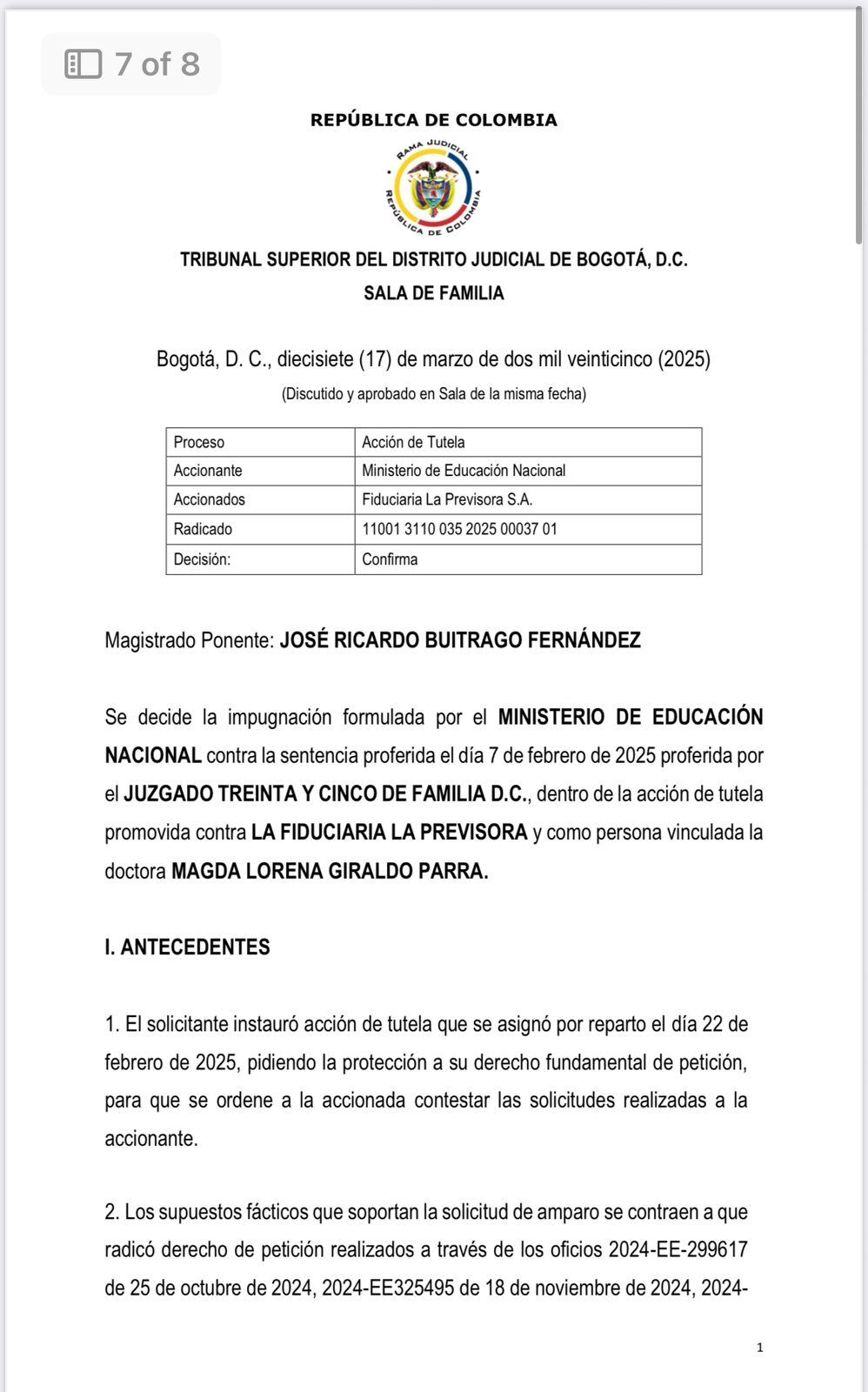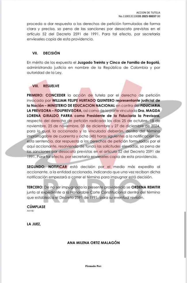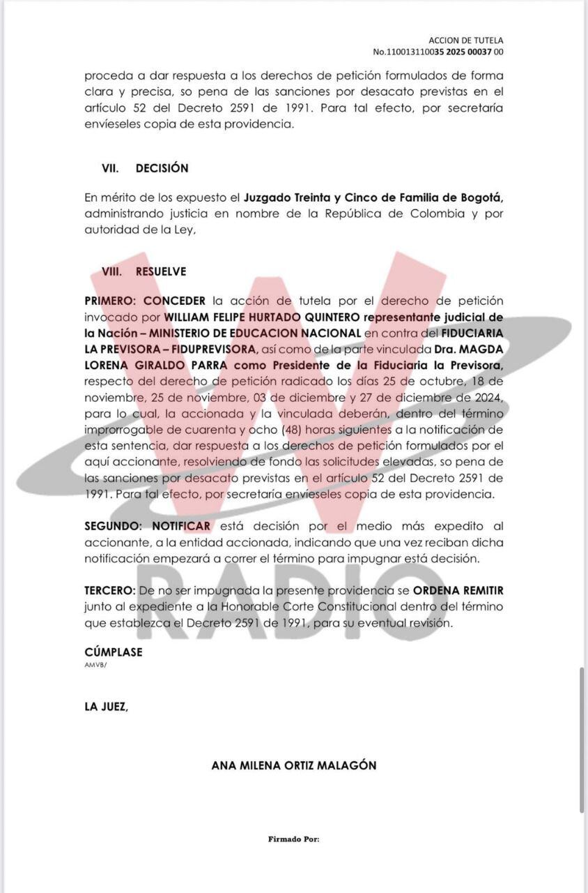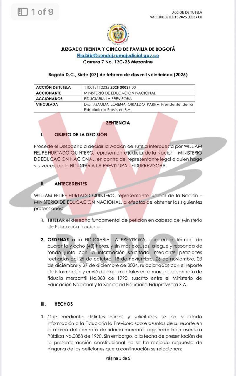 La cartera, luego de radicar varios derechos de petición y no obtener respuesta, radicó en febrero de 2025 una acción de tutela en contra de la Fiduprevisora; en ese proceso, el Tribunal 35 de Derecho de Familia de Bogotá decidió entutelar el derecho fundamental de petición del Ministerio de Educación.
