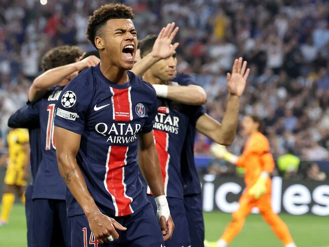 Desire Doue del PSG celebra su doblete marcado ante el Inter en la final de la Champions League. FOTO: EFE/EPA/RONALD WITTEK / RONALD WITTEK (EFE)