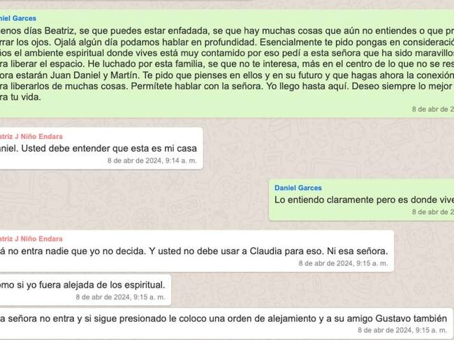 ** Daniel Garcés: “Lo entiendo claramente, pero es donde viven mis hijos”.>Beatriz Niño: “Acá no entra nadie que yo no decida. Y usted no debe usar a Claudia para eso. Ni esa señora”.