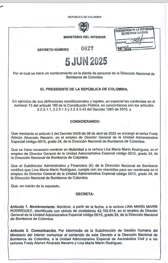 El Ministerio del Interior expidió el decreto en donde se confirma el nombramiento de la capitán de Bomberos, Lina María Marín, quien será la nueva directora nacional de la entidad.