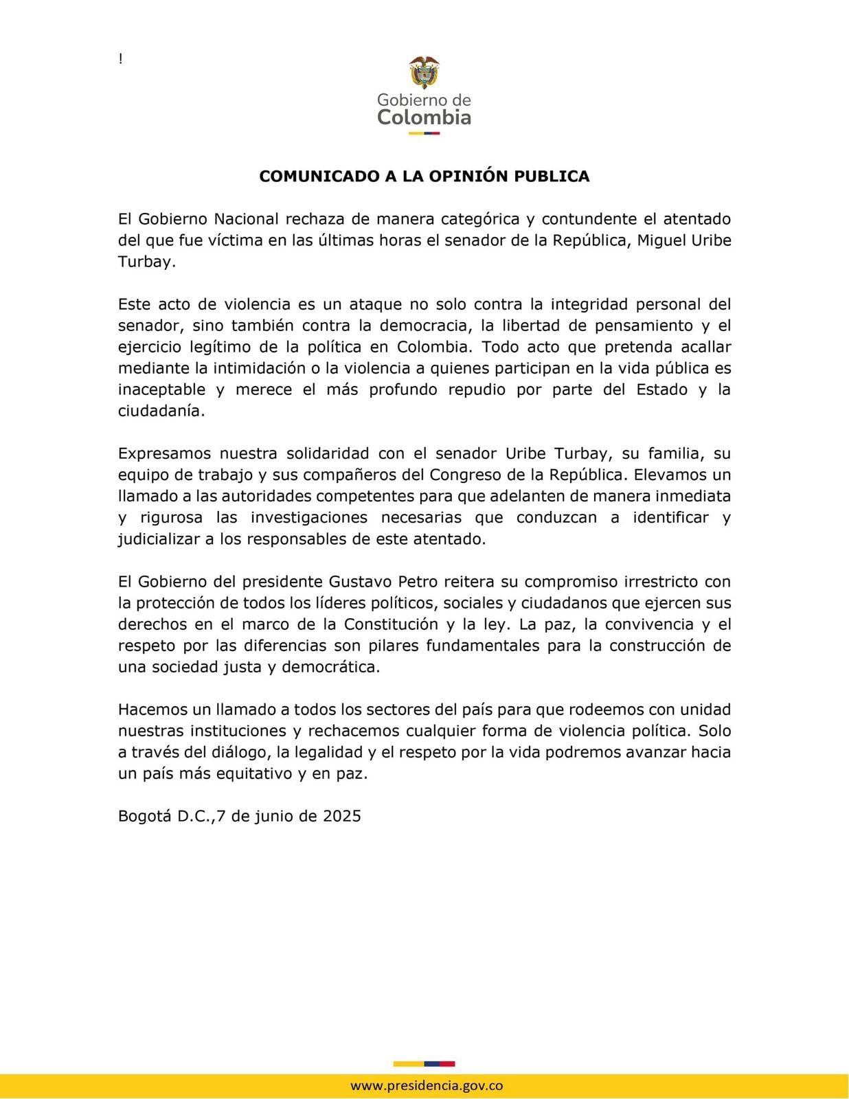 A través de un comunicado, la Presidencia de la República rechazó el atentado contra el precandidato presidencial Miguel Uribe, perteneciente al Centro Democrático, este 7 de junio en Bogotá.