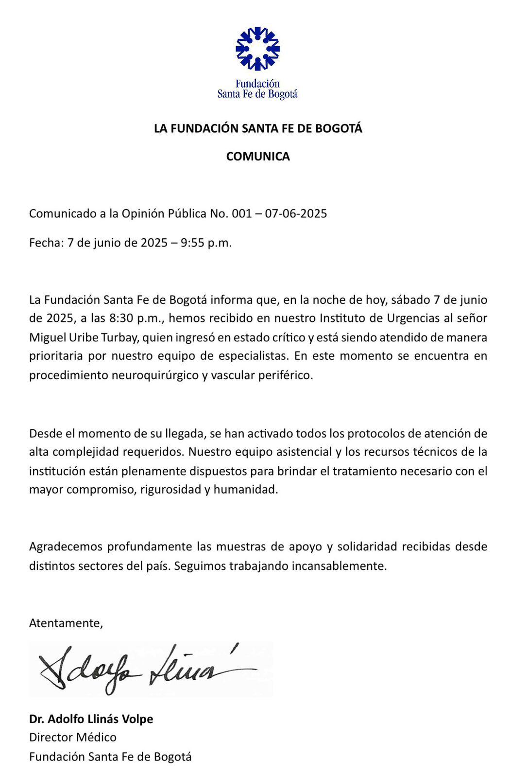 La Fundación Santa Fe de Bogotá informó que el senador Miguel Uribe Turbay fue ingresado en su Instituto de Urgencias el sábado 7 de junio de 2025, a las 8:30 p.m., en estado crítico. Según el comunicado oficial, Uribe está siendo atendido de forma prioritaria por los equipos especializados de la institución.