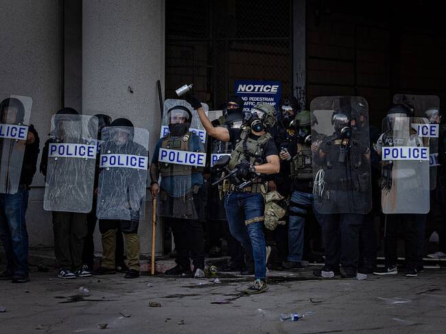 Las protestas realizadas este domingo derivaron en enfrentamientos entre manifestantes y agentes de la Policía local (LAPD), que calificaron la manifestación como una “asamblea ilegal”, para poder dispersar a las multitudes, aunque no se han informado de arrestos.