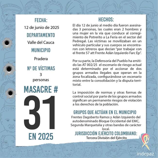Indepaz registró este hecho como la masacre número 31 ocurrida en Colombia en lo que va del 2025.