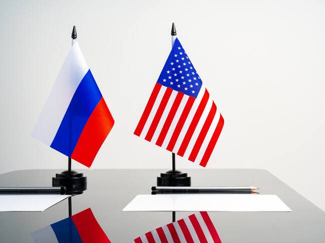 Banderas de Rusia y Estados Unidos. Foto: FabrikCr vía Getty Images. / FabrikaCr