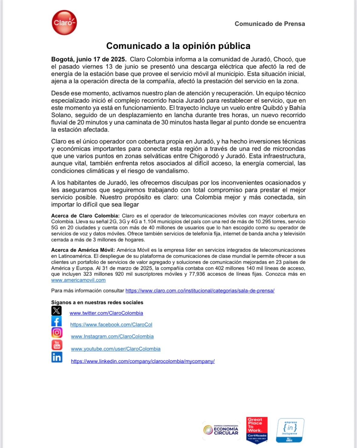 Comunicado de Claro Colombia explicando la falla del servicio en Juradó, Chocó. Foto: Suministrada.