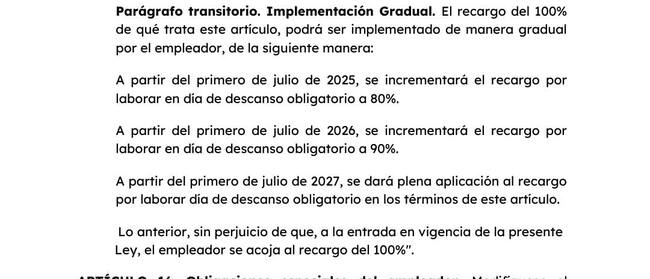 - A partir del 1 de julio de 2027 se incrementará el recargo por laborar el día de descanso obligatorio a 100%