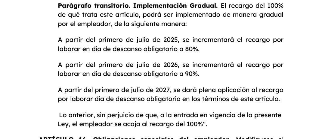 - A partir del 1 de julio de 2027 se incrementará el recargo por laborar el día de descanso obligatorio a 100%