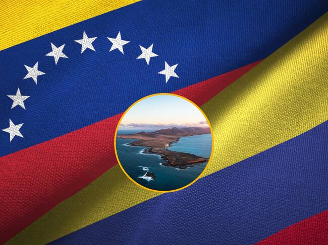 Banderas de Venezuela y Colombia, imagen de referencia. En el círculo, una imagen de referencia de una península. Fotos: Getty Images.