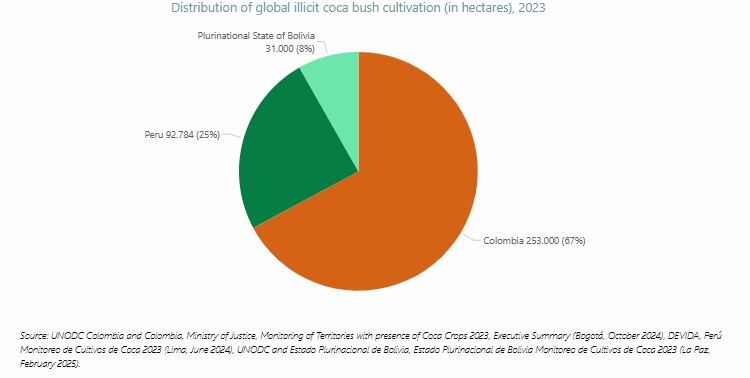 Uno de los puntos importantes de este informe es la distribución mundial de los cultivos de coca, menciona que, del total, los cultivos de hoja de coca superan las 376.000 hectáreas, de las cuales el 67%, unas 253.000 hectáreas, están en Colombia, seguido de Perú con 92.784 (25%) hectáreas y Bolivia con 31.000(8%).