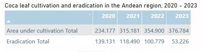 La erradicación de la hoja de coca presentó un decrecimiento en 2023, manteniendo la constante (-47% que el año anterior y -62% desde 2020), mientras que el cultivo mantiene su incremento, (6% más que el año anterior y 61% desde el 2020), lo que representa un nuevo récord.