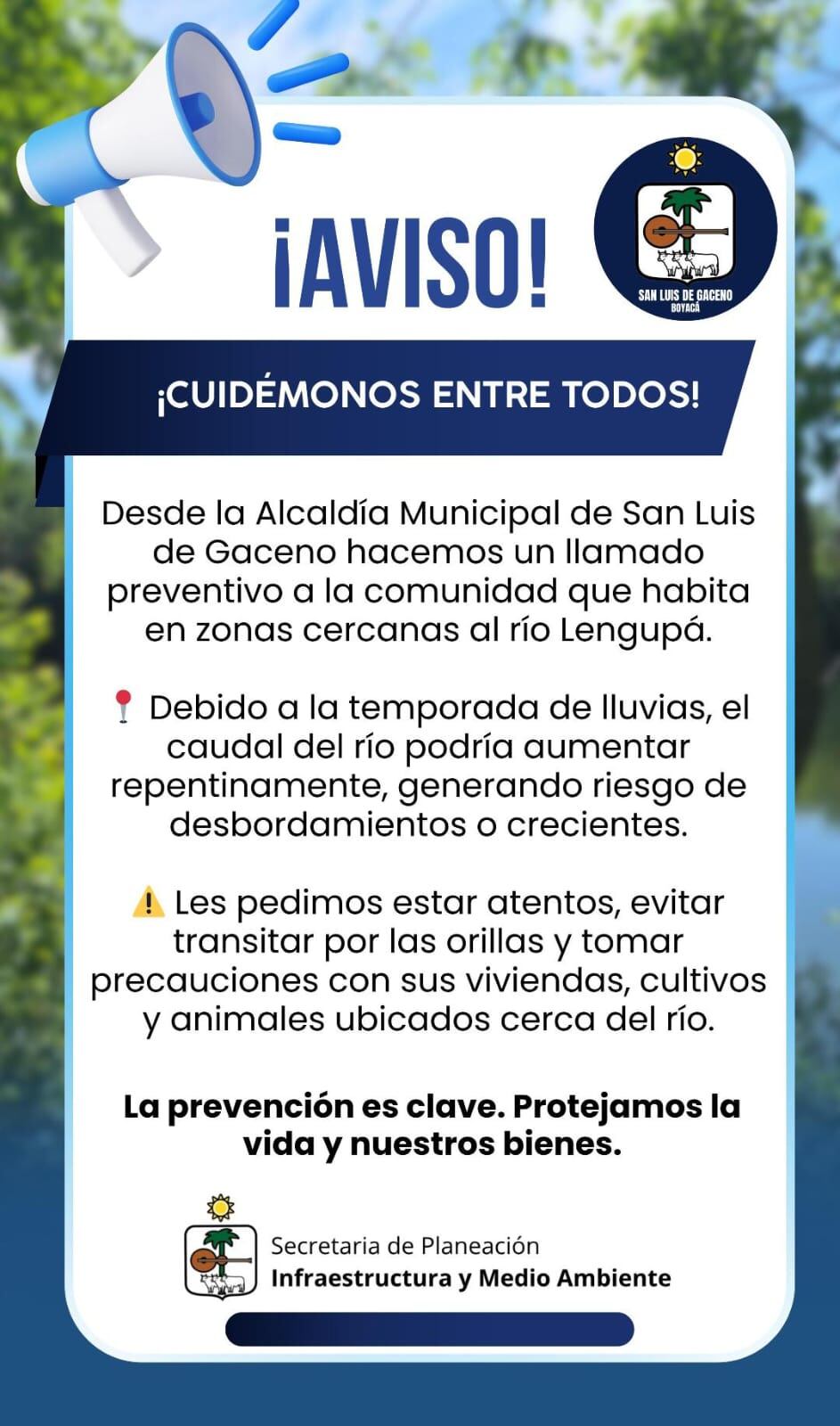 La alcaldía del municipio de San Luis de Gaceno, Boyacá, emitió una alerta a la comunidad que habita en zonas cercanas al río Lengupá, con el fin de que se evite transitar por el sector debido al aumento de su caudal.