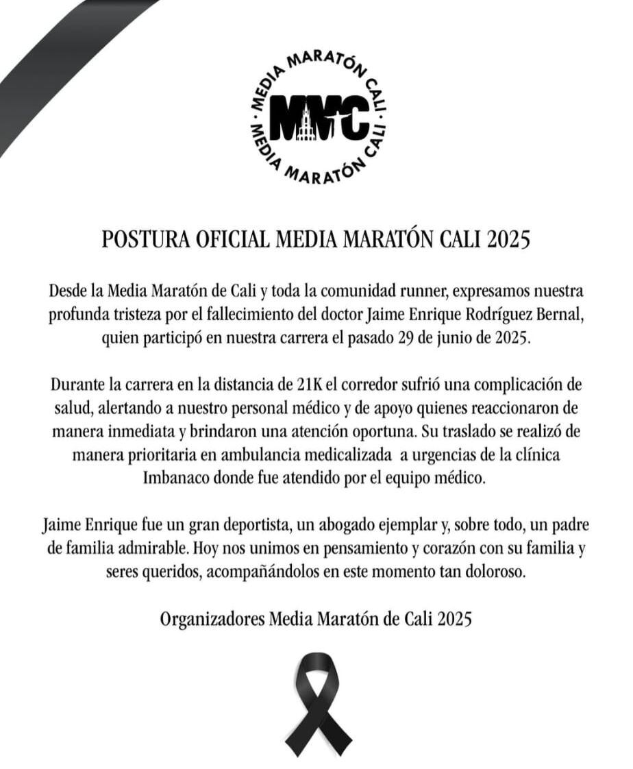La Media Maratón de Cali celebró este año su edición número 25, con la participación de más de 16.000 corredores de 33 países. Aunque fue una jornada significativa para el deporte en la ciudad, terminó marcada por esta lamentable pérdida.
