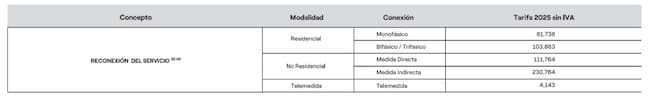 Para el 2025, los costos del restablecimiento del servicio son: