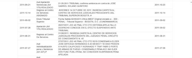 - 19 de agosto de 2011: el juez 19 Penal del Circuito con función de conocimiento de Bogotá lo condenó a 24 meses de prisión (2 años).