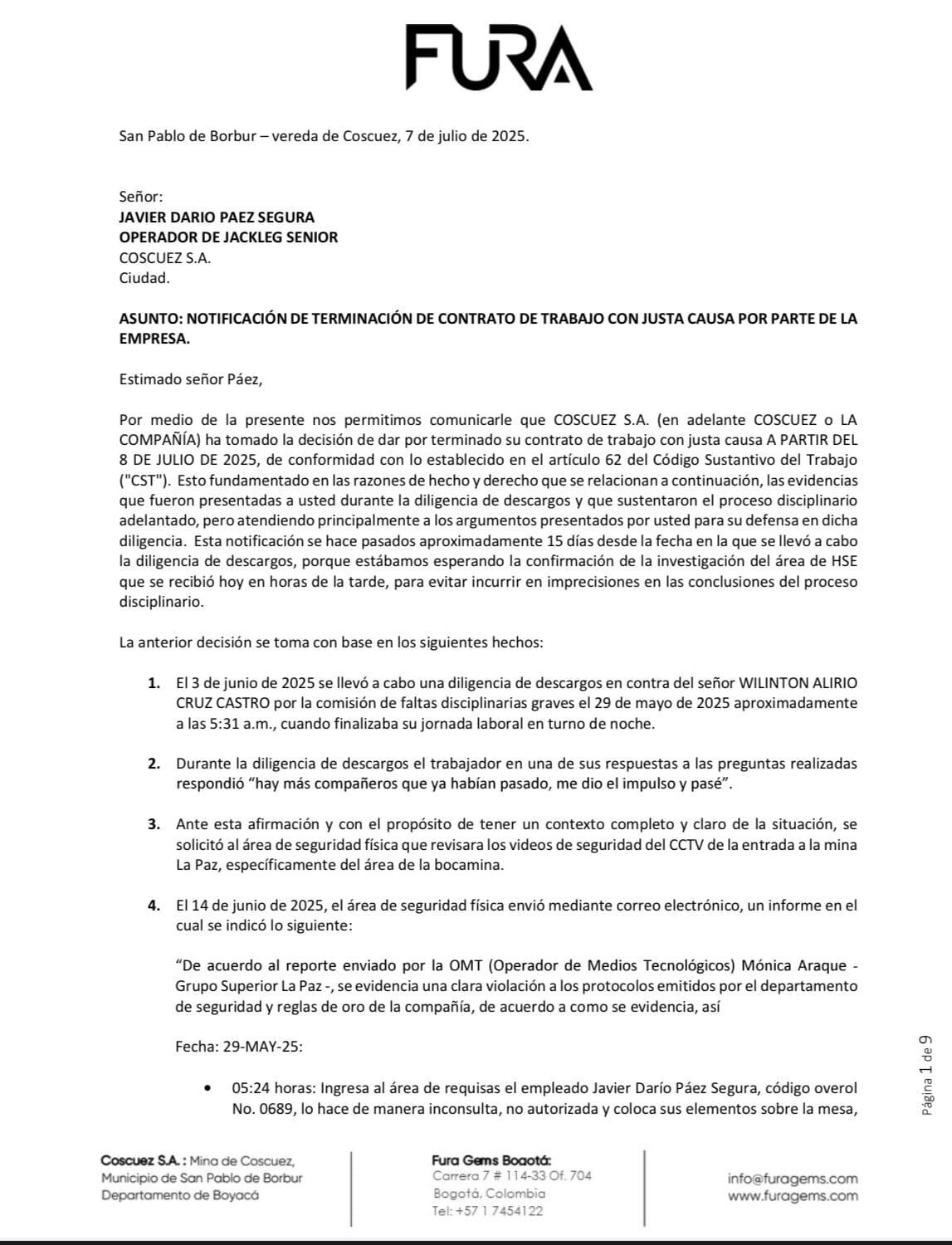 Este es el documento de despido por parte de Fura Gems al presidente de Sintramineriacoscuez, Javier Darío Páez Segura.