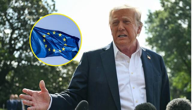Donald Trump y bandera de la UE. Foto: ANDREW CABALLERO-REYNOLDS/AFP/fhm vía Getty Images.