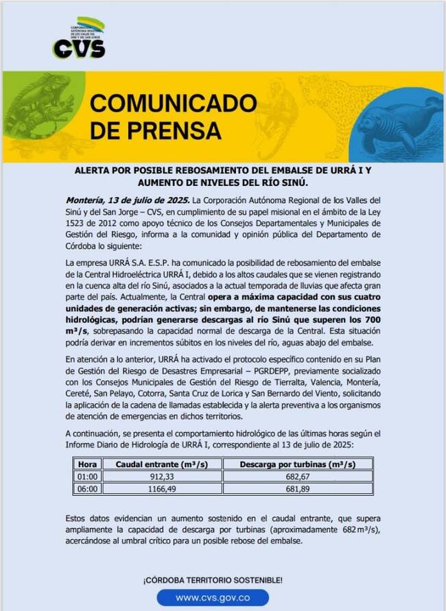 Según el director técnico de Ambiente y Riesgo departamental, Henry Licona, hasta el momento, no se ha sobrepasado la cota 130 de rebose del embalse de la Central Hidroeléctrica Urrá I. Sin embargo, las autoridades mantienen un monitoreo permanente debido a los altos caudales registrados en la cuenca alta, como consecuencia de la temporada de lluvias.
