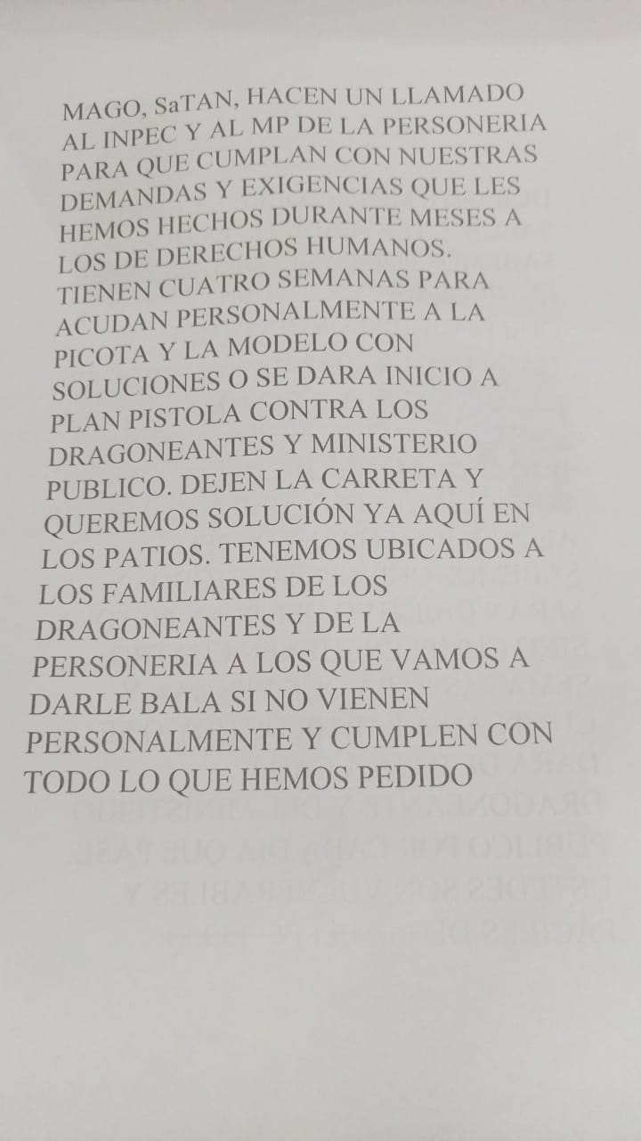 Según los delincuentes, la amenaza se debe a que no tienen garantías dentro de las cárceles: las condiciones de salud y de alimentación no son las mejores, y se están haciendo traslados con los que no están de acuerdo.