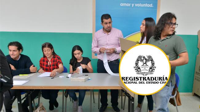 Jurado de votación en elecciones presidenciales de Colombia 2022 y logo de la Registraduría. Foto: Gabriel Aponte/Getty Images y página de la Registraduría Nacional.
