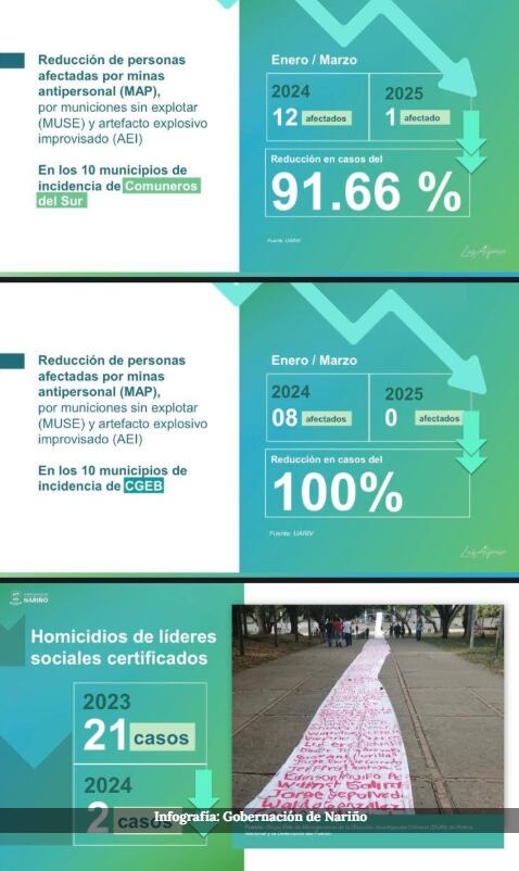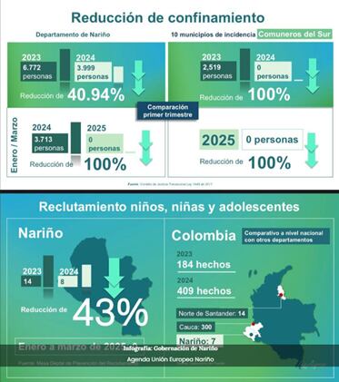 El informe presentado en la agenda internacional el Gobierno de Nariño aseguró que desde el inicio de las mesas a la fecha el departamento ha tenido una reducción significativa de hechos que vulneran los derechos humanos principalmente en diez municipios en donde estos grupos han incidido históricamente, entre estos el desplazamiento forzado estimado en 87% entre 2023 y 2025.