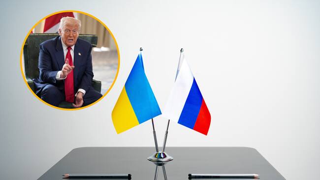 Donald Trump y banderas de Rusia y Ucrania. Foto: Andrew Harnik y Getty Images.