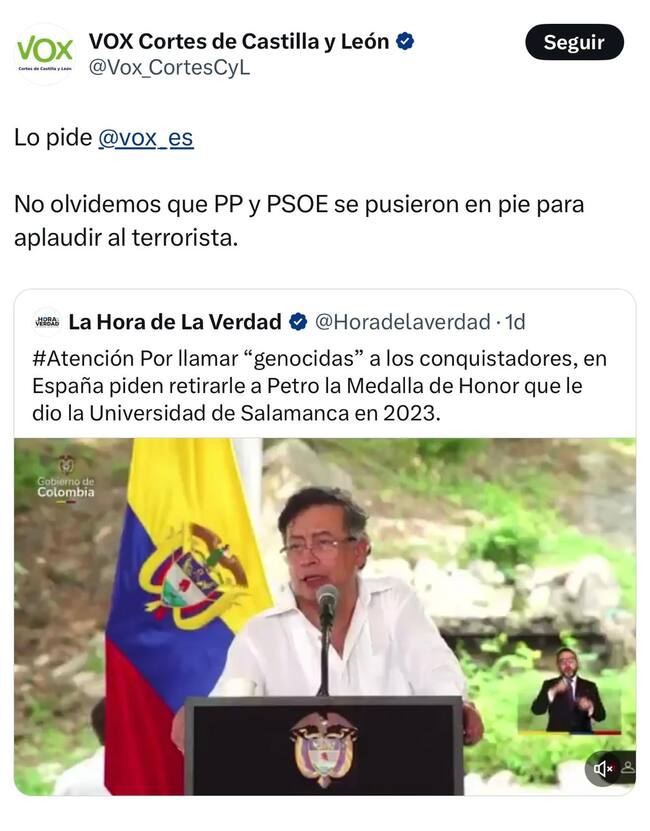 Políticos pertenecientes al partido Vox de España rechazaron las palabras del presidente Gustavo Petro con las que calificó de “genocidas” a los conquistadores.