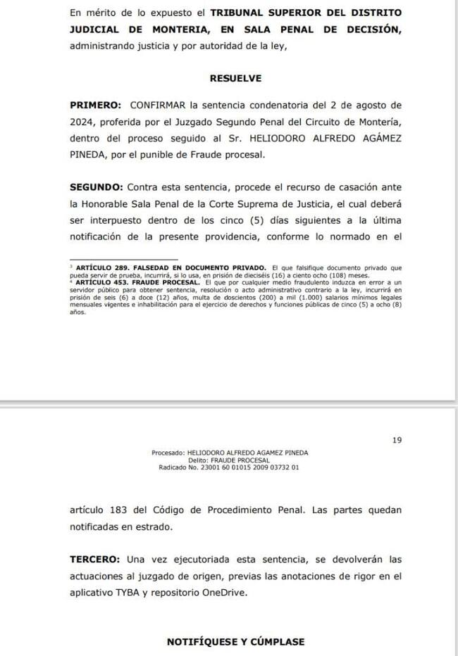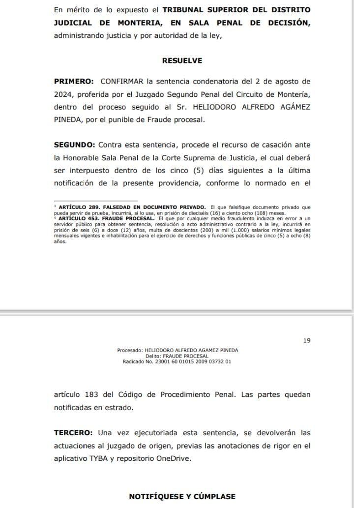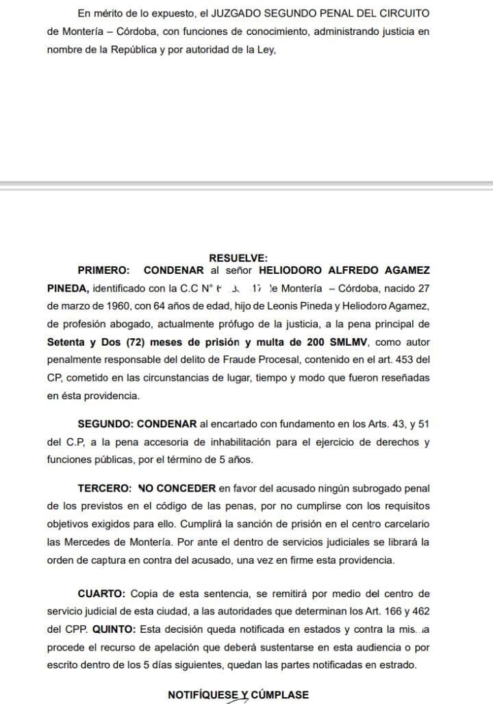 La W Radio conoció que el Tribunal Superior de Montería a través de su Sala Penal ratificó la condena de 6 años de prisión contra el polémico abogado Heliodoro Agámez Pineda, por fraude procesal. La decisión de primera instancia se había adoptado por parte del Juzgado Segundo Penal del Circuito de Montería el 2 de agosto del año 2024.