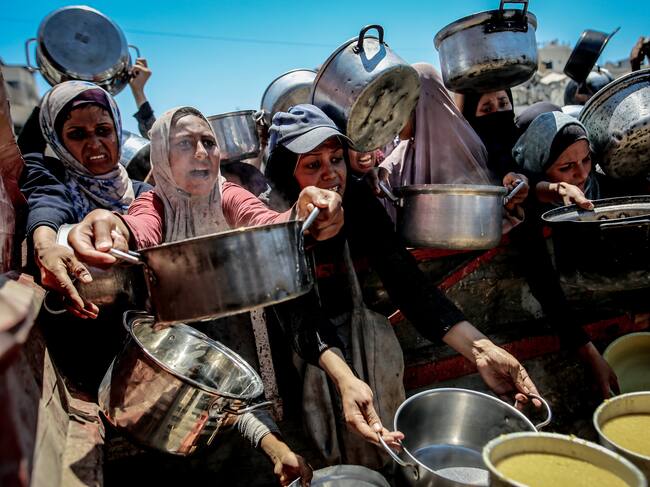 Palestinos, que tienen dificultades para acceder a alimentos debido al bloqueo impuesto por Israel, esperan para recibir comida caliente en la Franja de Gaza el 4 de agosto de 2025. (Foto de Saeed M. M. T. Jaras/Anadolu vía Getty Images) / Anadolu