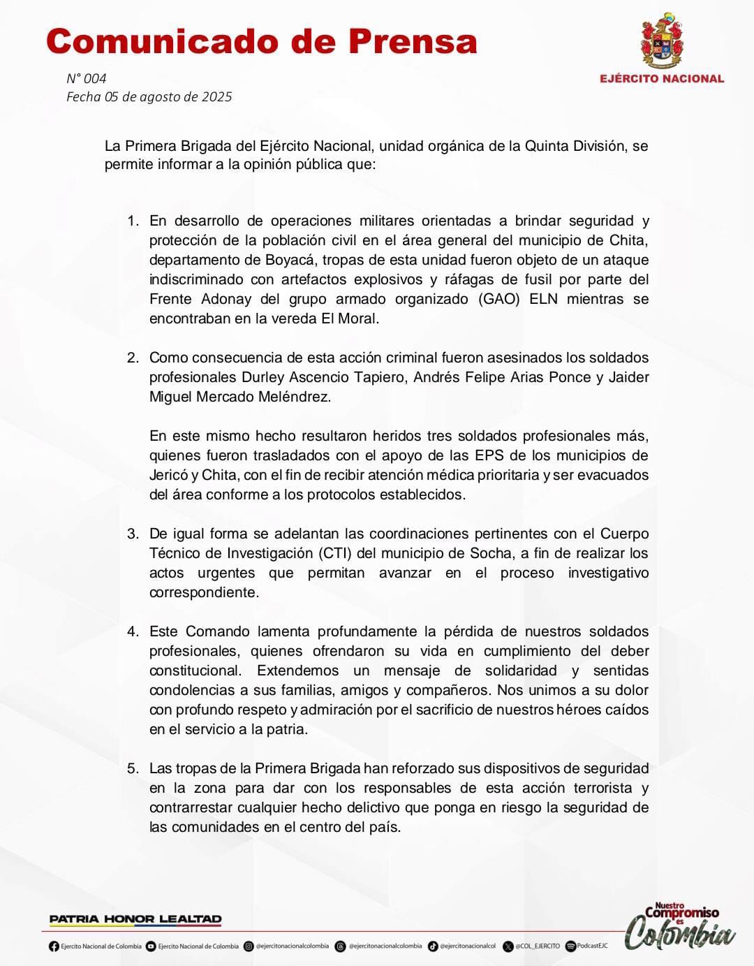En el municipio de Chita, Boyacá, se registró una emboscada por integrantes del ELN, que dejó como resultado tres soldados muertos y otros tres heridos.