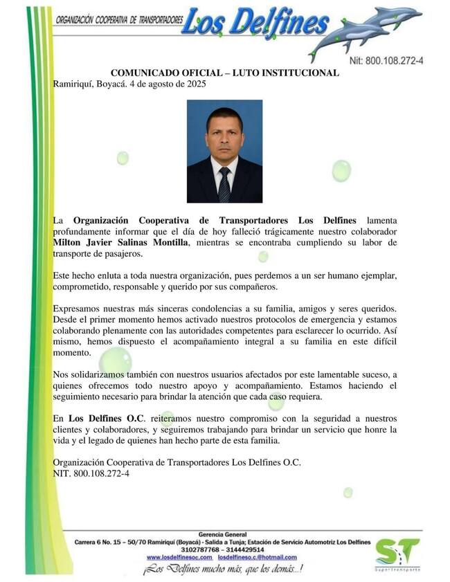 “La Organización Cooperativa de Transportadores Los Delfines lamenta profundamente informar que falleció trágicamente nuestro colaborador Milton Javier Salinas Montilla, mientras se encontraba cumpliendo su labor de transporte de pasajeros. Este hecho enluta a toda nuestra organización, pues perdemos a un ser humano ejemplar, comprometido, responsable y querido por sus compañeros”, indicaron.