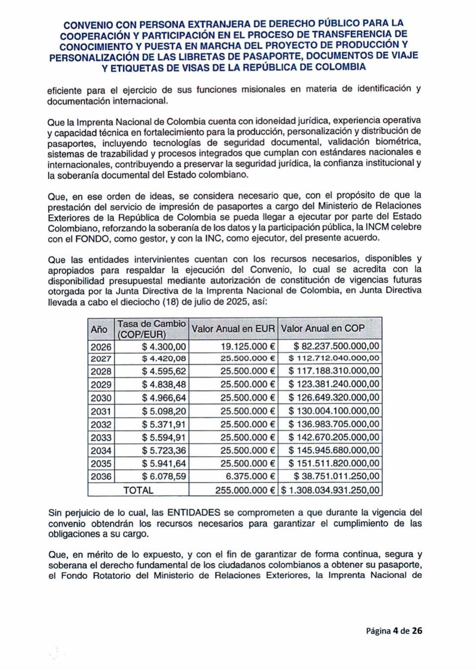 De igual forma, la Imprenta Nacional deberá pagar 17 euros por cada pasaporte colombiano.