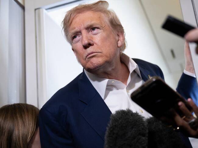 El presidente de EEUU, Donald Trump, escucha las preguntas de los periodistas a bordo del Air Force One sobre el Reino Unido el 29 de julio de 2025, mientras regresa a Washington tras un viaje a Escocia. (Foto de BRENDAN SMIALOWSKI/AFP vía Getty Images) / BRENDAN SMIALOWSKI