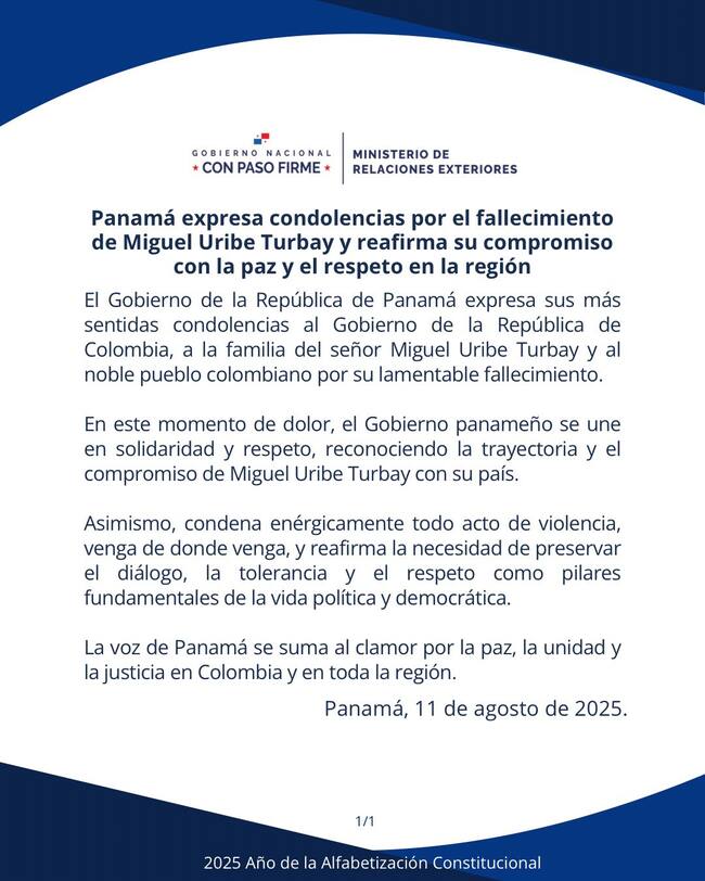 “El Gobierno de la República de Panamá expresa sus más sentidas condolencias al Gobierno de la República de Colombia, a la familia del señor Miguel Uribe Turbay y al noble pueblo colombiano por su lamentable fallecimiento”, anunció el Ministerio de Relaciones Exteriores en un comunicado.
