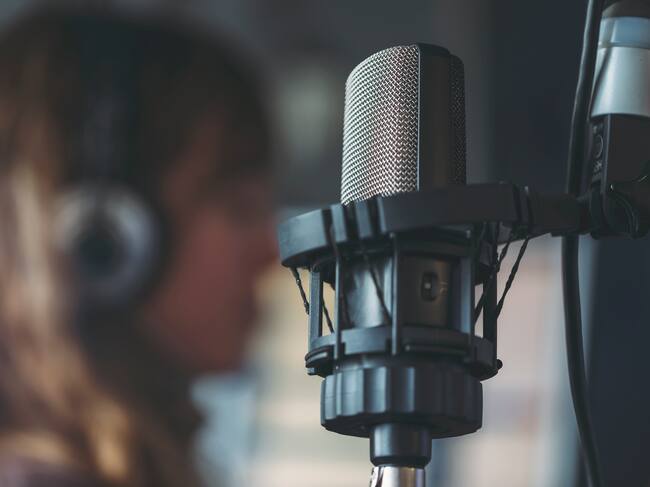 Close up of microphone in radio broadcast studio and female radio host on the background / Cris Cantón