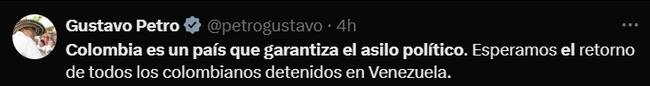 “Colombia es un país que garantiza el asilo político”, escribió Petro en X al comentar la noticia de que Díaz, según dijo ella misma en esa red social, está en el país andino, tras salir, “en compañía de parte de la familia”, de la residencia de la Embajada de Colombia en Caracas.