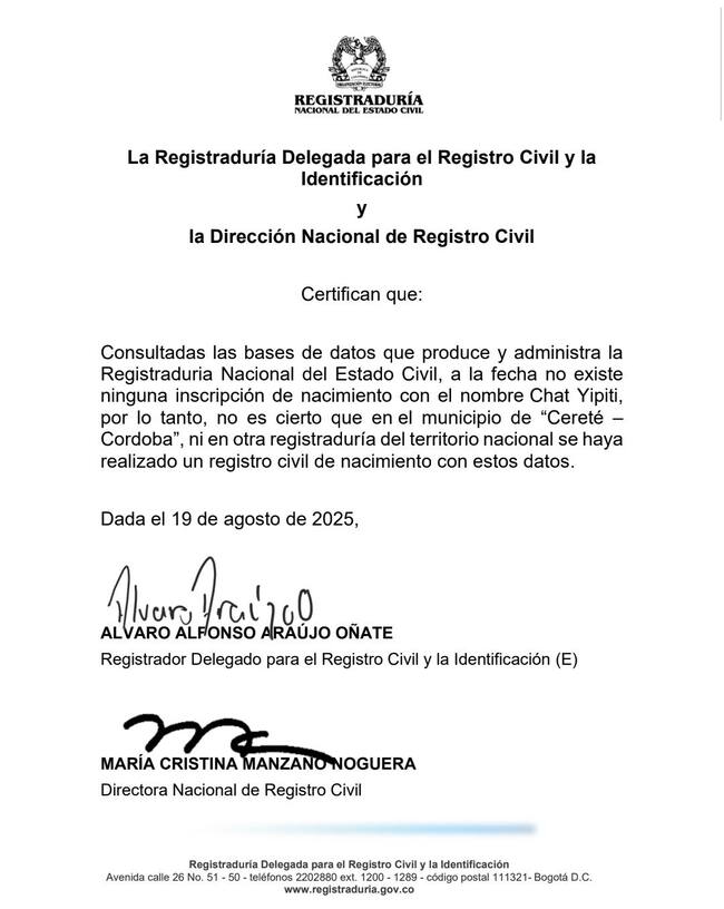 Ante la circulación en redes sociales y algunos medios nacionales de un curioso caso en Cereté, Córdoba, donde una niña supuestamente había sido registrada como “Chat Yipiti Batidas Guerra”, nombre inspirado en la inteligencia artificial ChatGPT, La W consultó con fuentes de la Registraduría y Notaría de este municipio, las cuales coincidieron en que se trataba de una información falsa.