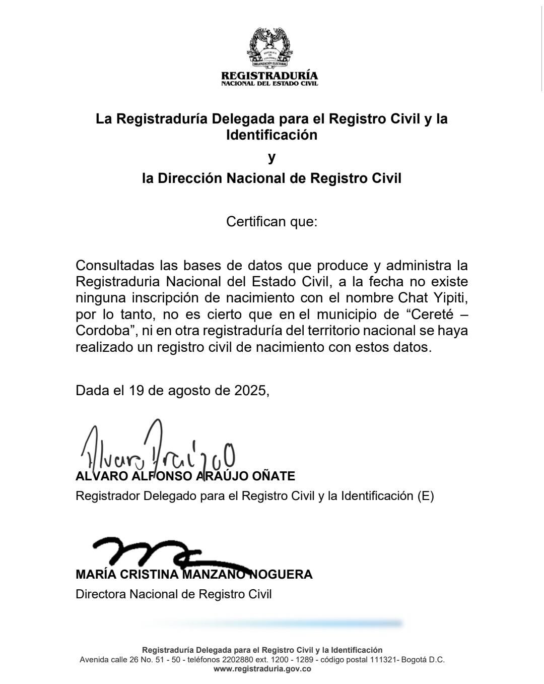 Desmienten que niña haya sido registrada como ‘Chat Yipiti’ en Cereté, Córdoba