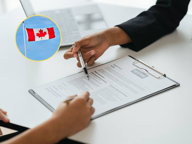 De fondo, una persona presentando su hoja de vida y aplicando para un trabajo. En el círculo, la bandera de Canadá / Fotos: GettyImages