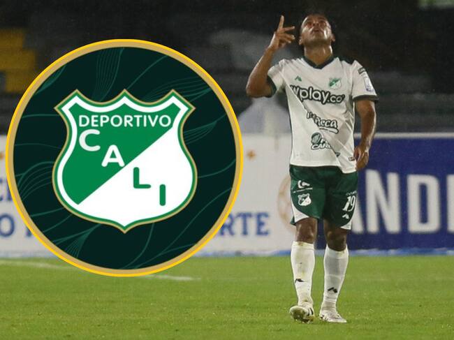 Escudo del Deportivo Cali y Johan Martínez. Fotos: X @AsoDeporCali / (Colprensa - Lina Gasca).