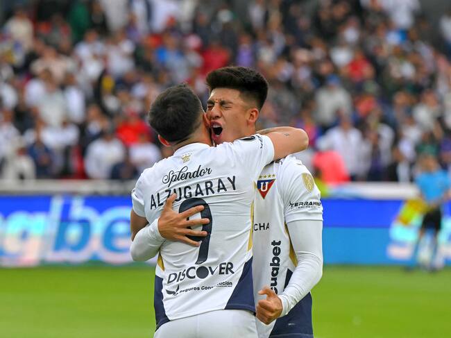 Gabriel Villamil celebra con su compañero, Lisandro Alzugaray en el partido, Liga de Quito vs Botafogo de Brasil en el estadio Rodrigo Paz Delgado en Quito el 21 de agosto de 2025. (Foto de RODRIGO BUENDIA/AFP via Getty Images) / RODRIGO BUENDIA