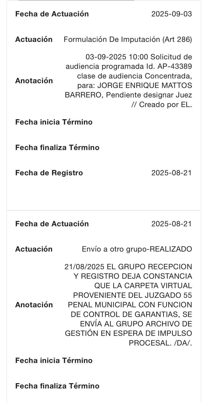 Cabe recordar que la diligencia programada para el viernes 15 de agosto ante el juez 55 penal municipal con función de control de garantías no se llevó a cabo porque tres de los indiciados no acudieron a la audiencia, mientras que Jorge Enrique Mattos Barrero y Misael García Téllez acudieron, pero sin el acompañamiento de sus abogados.