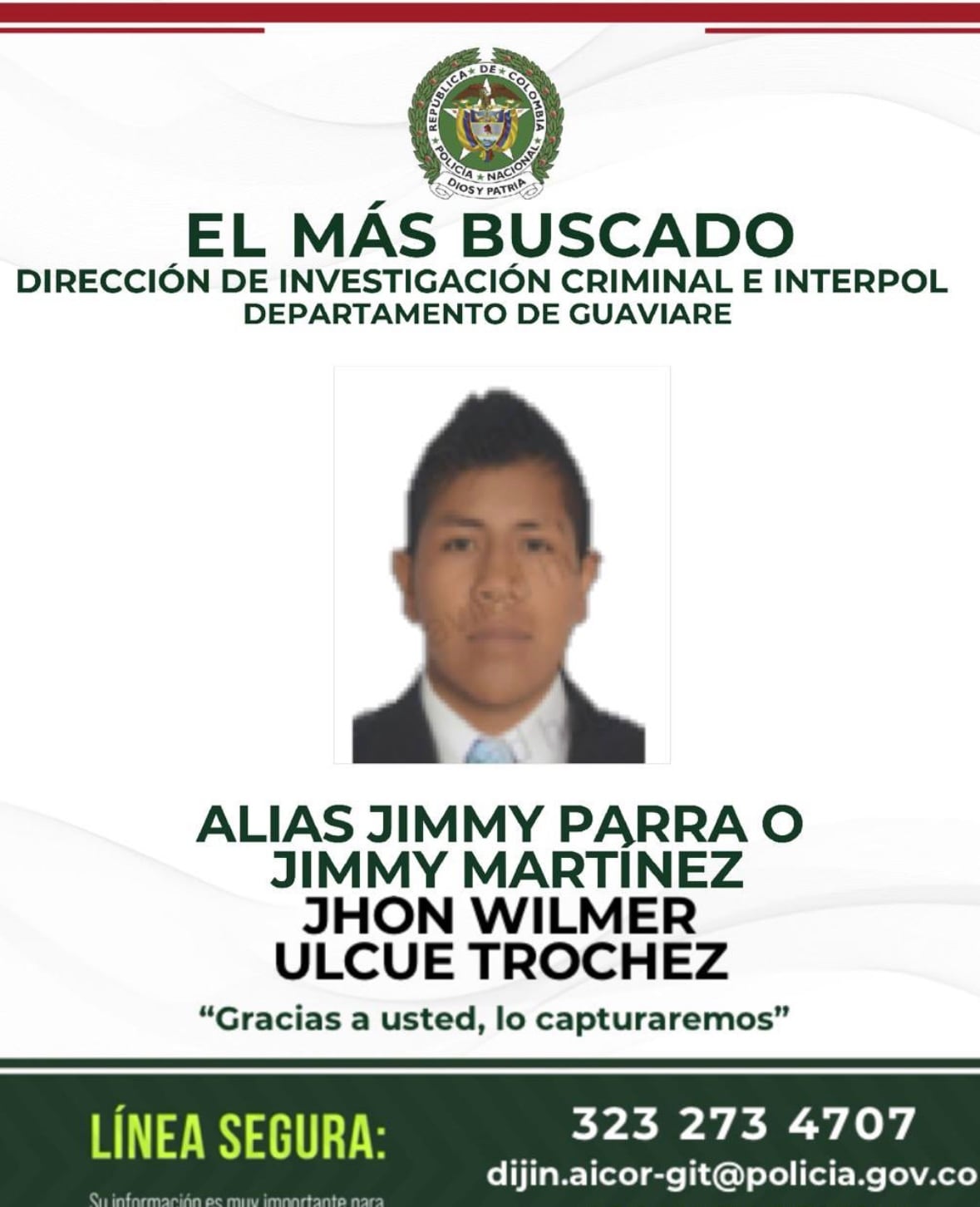 La Policía publicó el rostro del supuesto responsable del secuestro de 34 militares en Guaviare. Se trata de Jhon Wilmer Ulcue de la subestructura 44 “Antonio Ricaurte”.