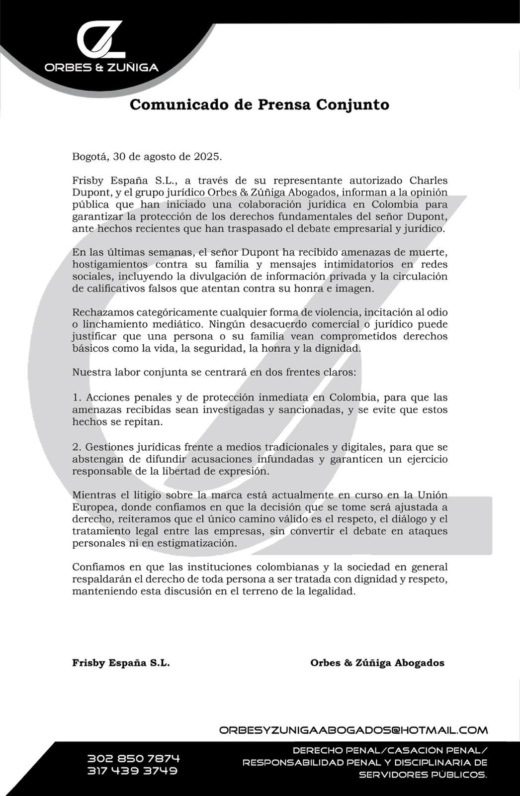 Charles Dupont, representante de Frisby España, aseguró que se han presentado amenazas contra su integridad provenientes de Colombia.